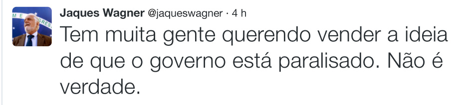 Num instante em que a gestão Dilma Rousseff parece esfarelar, o ministro Jaques Wagner, recém-convertido em chefe de gabinete da presidente, sentiu a necessidade de plugar-se à internet para proclamar numa rede social: “Tem muita gente querendo vender a ideia de que o governo está paralisado. Não é verdade.”